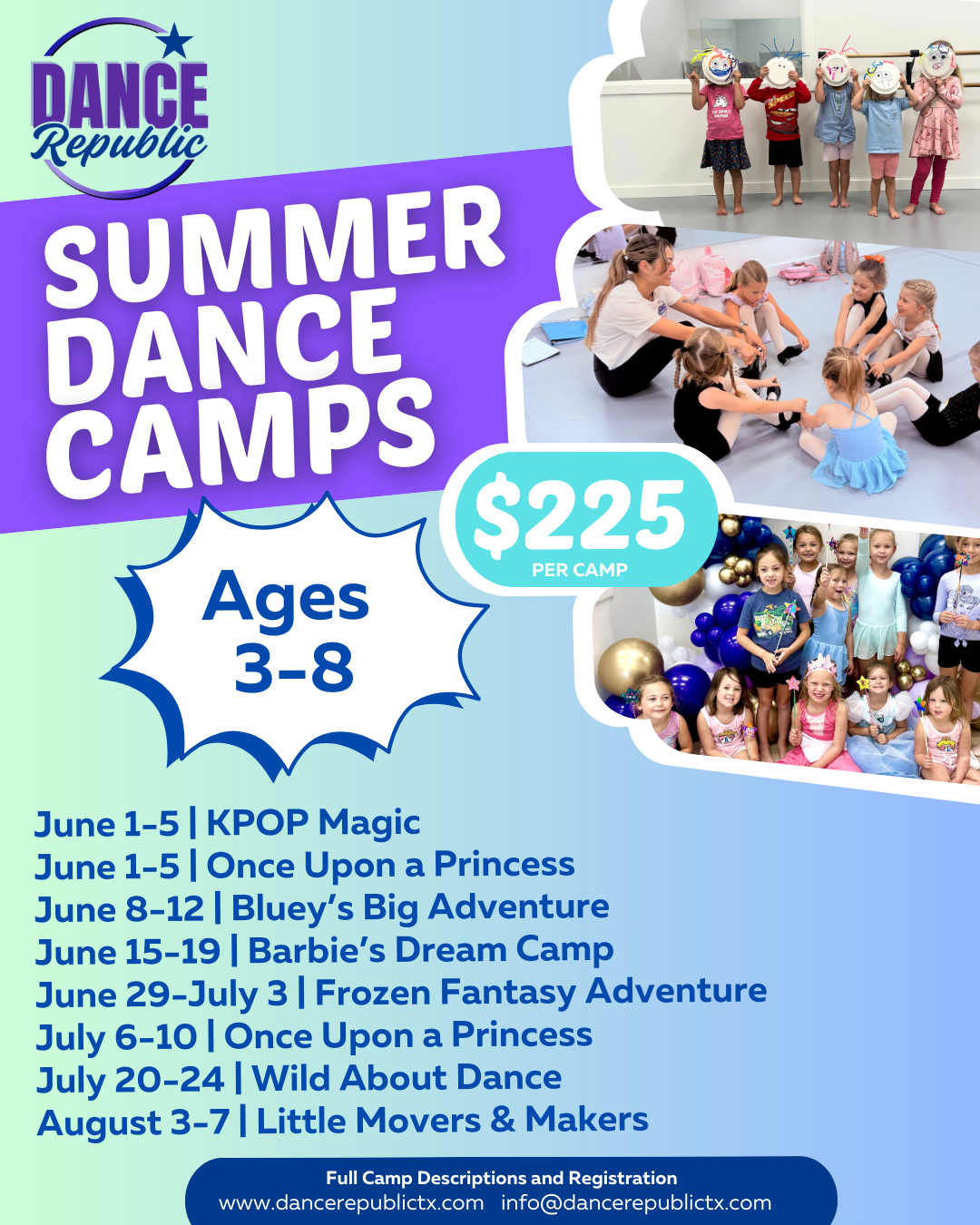 Step into a magical world inspired by beloved fairytale characters like Cinderella, Rapunzel, Belle, and Moana. Dancers will twirl, create, and explore storytelling through movement, crafts, and imagination while building confidence and friendships. Families are invited to celebrate with a charming end-of-week performance.