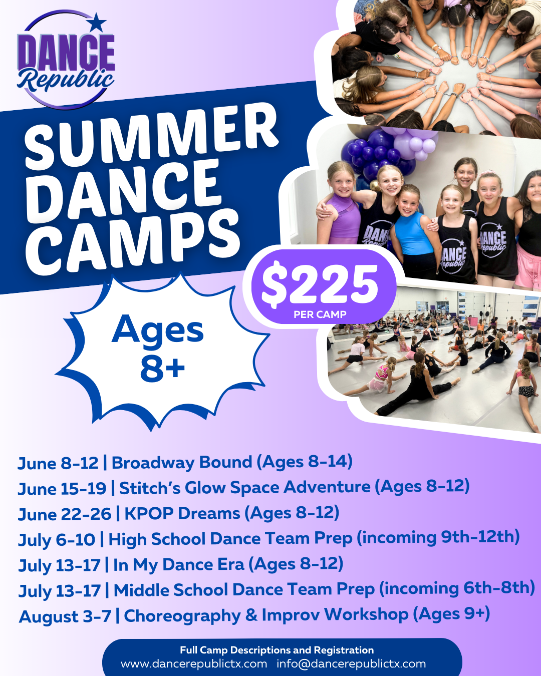 Blast off into creativity with a camp inspired by Stitch and space-themed fun! Dancers explore glowing crafts, themed choreography in jazz and hip hop, and imaginative activities in a high-energy environment. The week wraps up with an out-of-this-world glowing performance.