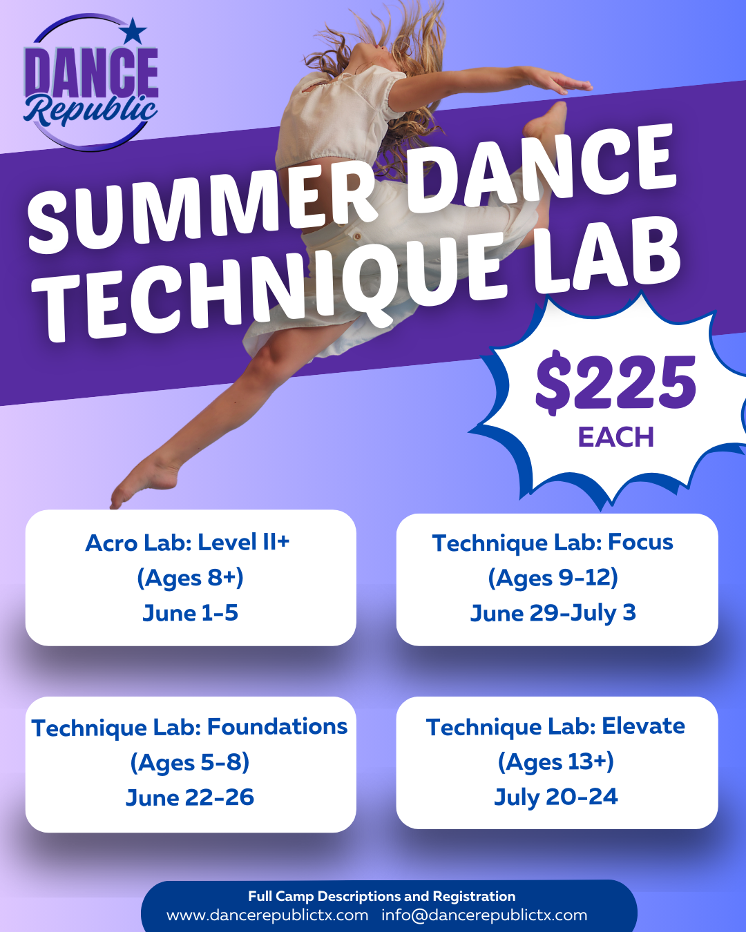 This lab is for dancers ready to refine precision, control, and execution through targeted training. Dancers will take classes in ballet, lyrical, jazz, contemporary, leaps & turns, and more. Emphasis is placed on quality of movement, body awareness, and building confidence in their skills. Families are invited to view a closing demonstration.